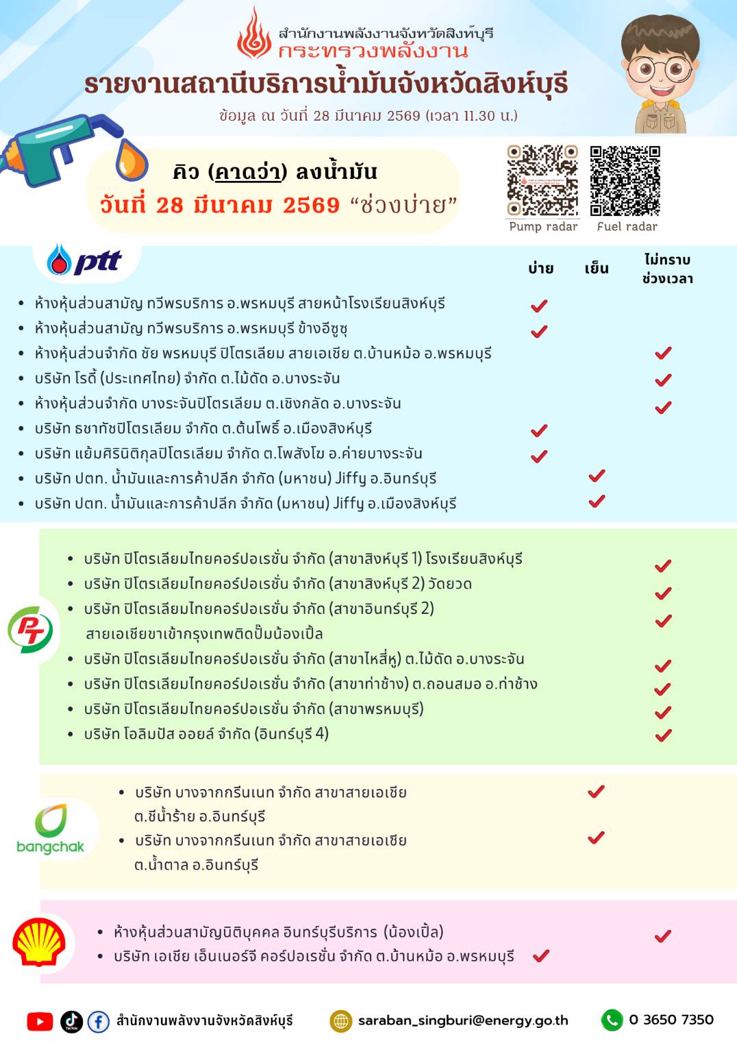 รายงานสถานีบริการน้ำมันจังหวัดสิงห์บุรี วันที่ 28 มีนาคม 2569 ช่วงบ่าย