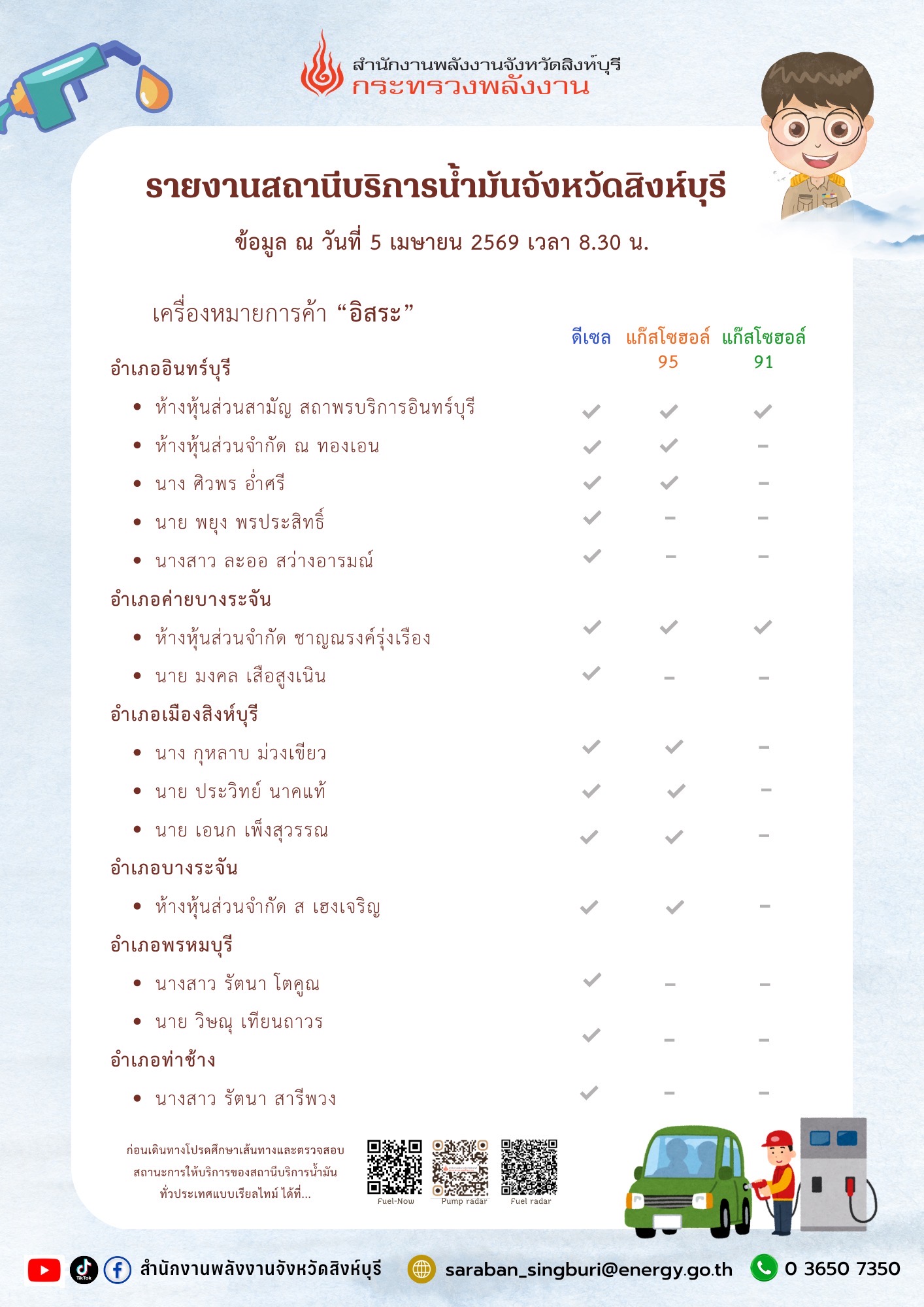 รายงานสถานีบริการน้ำมันจังหวัดสิงห์บุรี ข้อมูล ณ วันที่ 5 เมษายน 2569 เวลา 08.30 น. : อิสระ