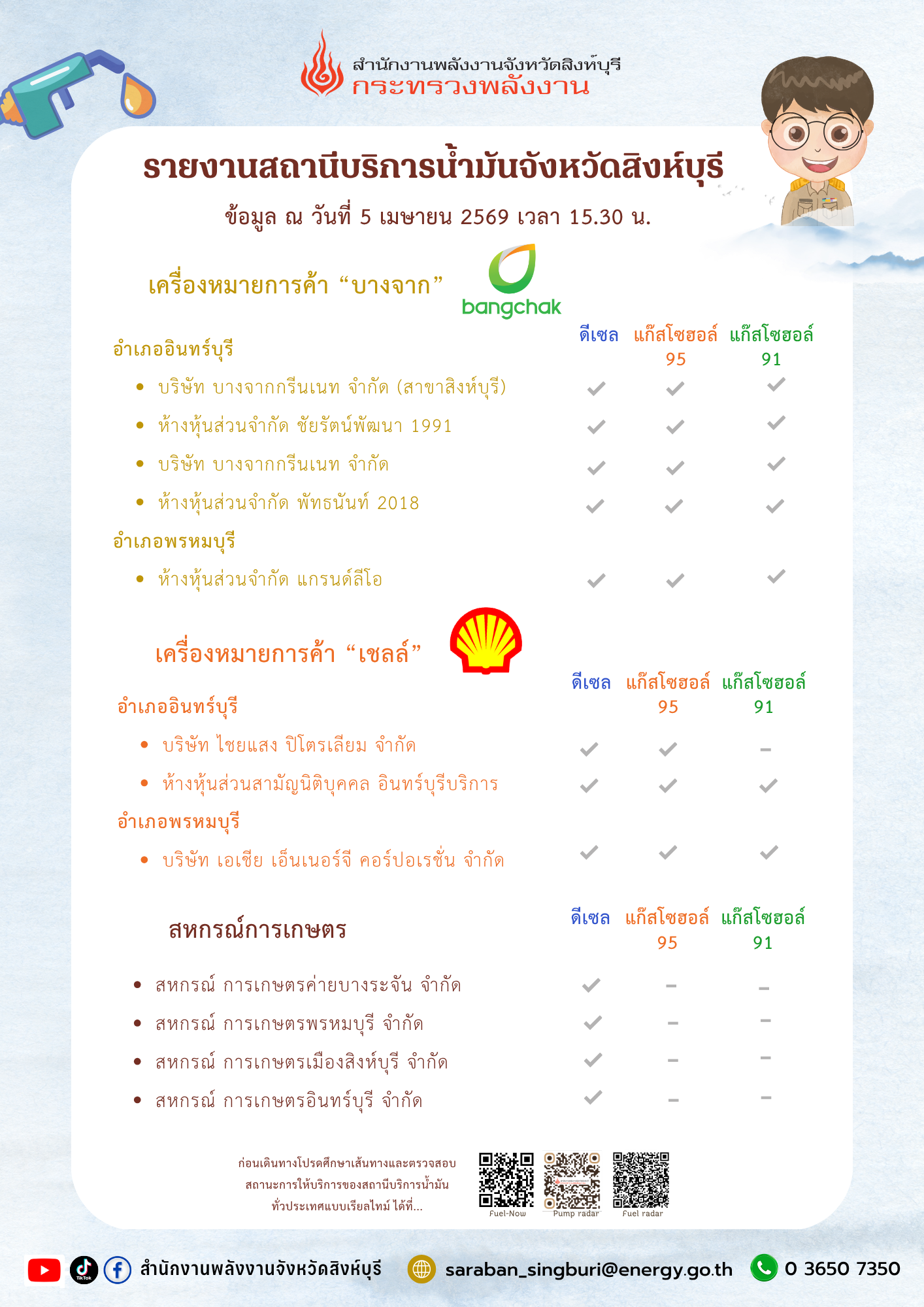 รายงานสถานีบริการน้ำมันของจังหวัดสิงห์บุรี วันที่ 5 เมษายน 2569 เวลา 15.30 น. : บางจาก เชลล์ สหกรณ์การเกษตร