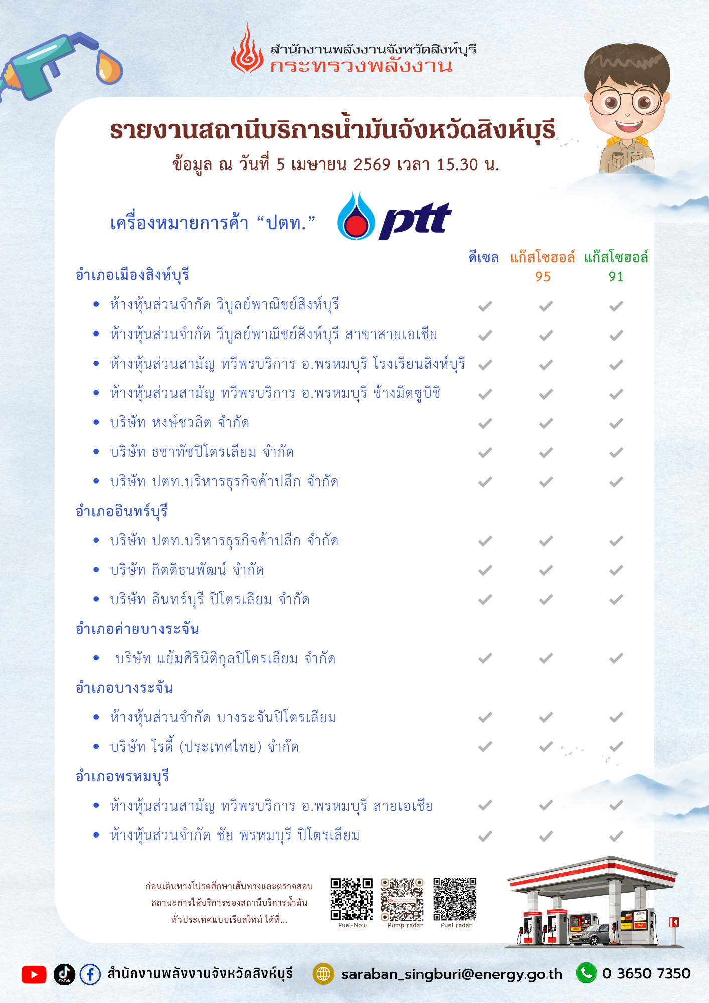 รายงานสถานีบริการน้ำมันของจังหวัดสิงห์บุรี วันที่ 5 เมษายน 2569 เวลา 15].30 น. : ปตท.