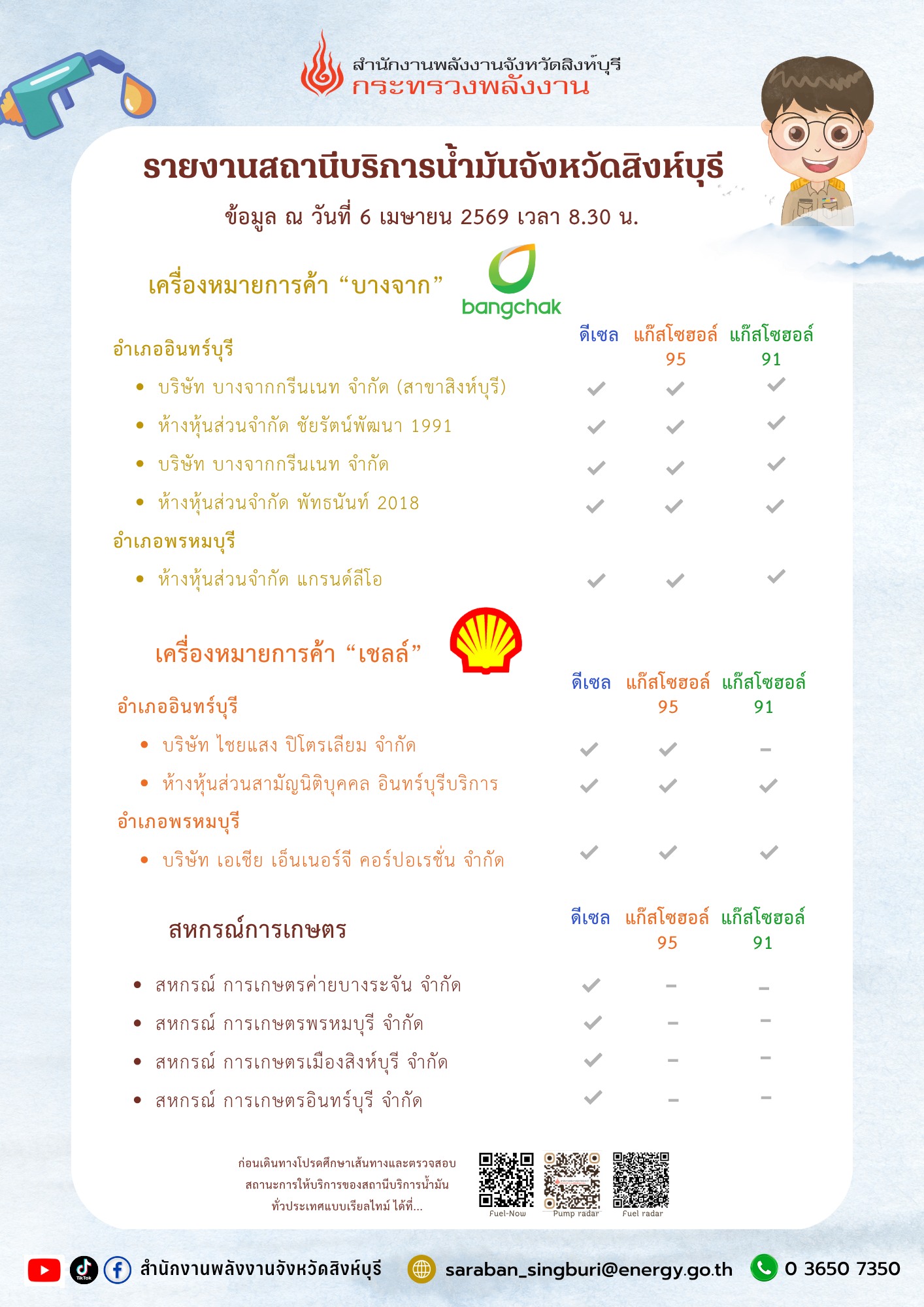 รายงานสถานีบริการน้ำมันจังหวัดสิงห์บุรี วันที่ 6 เมษายน 2569 เวลา 08.30 น. : บางจาก เชลล์ สหกรณ์การเกษตรฯ