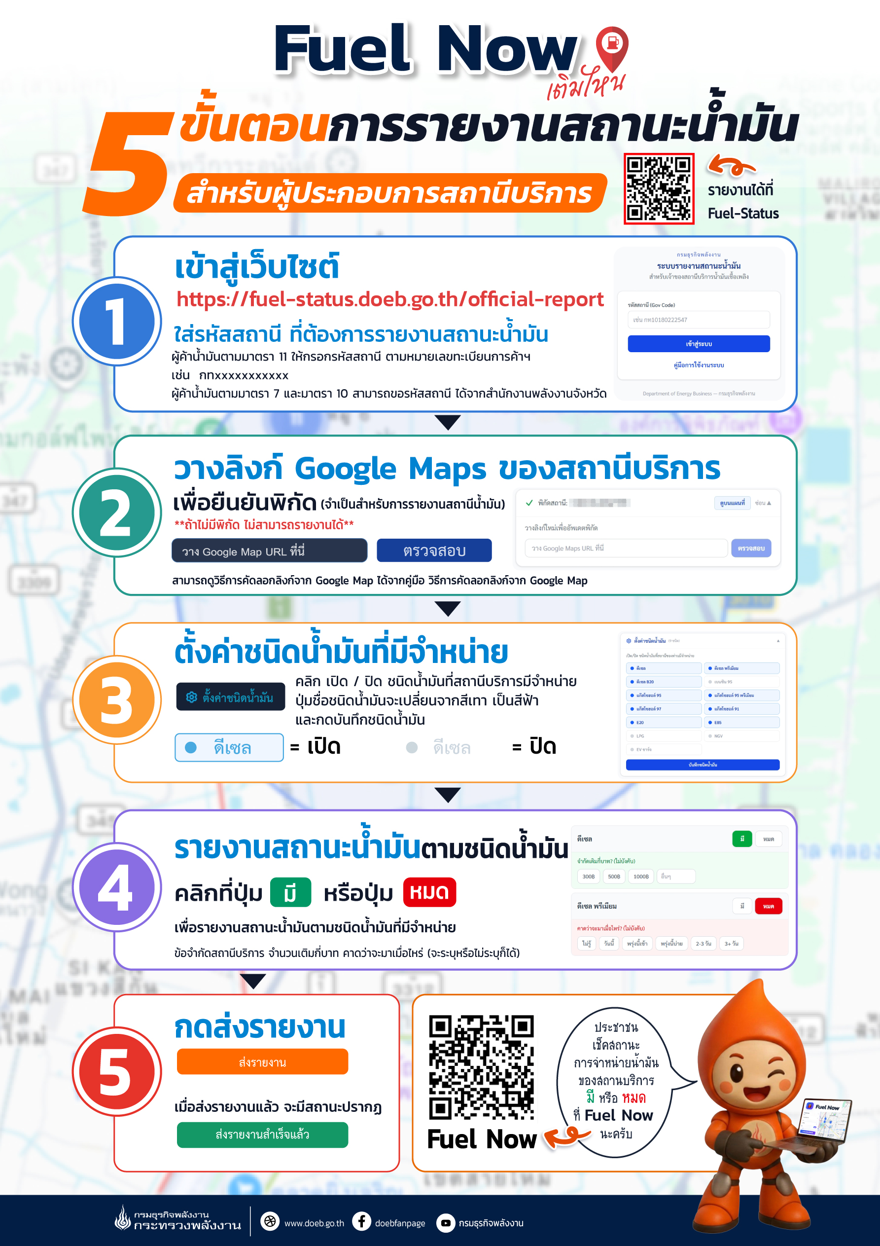 สำหรับผู้ประกอบการสถานีบริการน้ำมัน สามารถรายงานสถานะน้ำมันได้ง่ายๆ 5 ขั้นตอน ผ่าน เว็ปไซต์ Fuel Now : https://fuel-now.doeb.go.th/