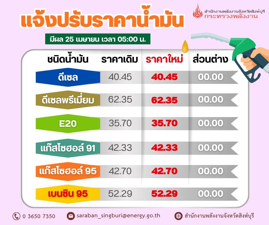 สำนักงานพลังงานจังหวัดสิงห์บุรี ได้ตรวจสอบและขอรายงานสถานการณ์พลังงานในจังหวัด ดังนี้
